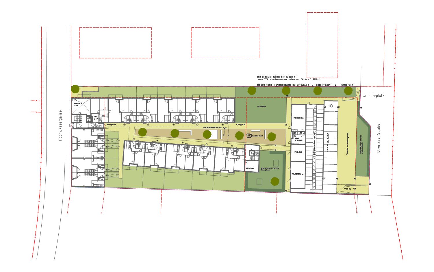 Die lang gezogene L-förmige Wohnhausanlage mit Erdgeschoß, Obergeschoß und Dachgeschoß erstreckt sich zwischen Hochwassergasse bzw. Liesingbachufer und der Oberlaaer Straße. Im atriumähnlichen Innenhof befindet sich ein weiteres Wohngebäude, im nördlichen Bauteil an der Oberlaaer Straße befinden sich PKW-Abstellplätze, Gemeinschaftsräume sowie Büroflächen. Die Erschließung erfolgt großteils über Laubengänge sowie über zwei Stiegenhäuser.