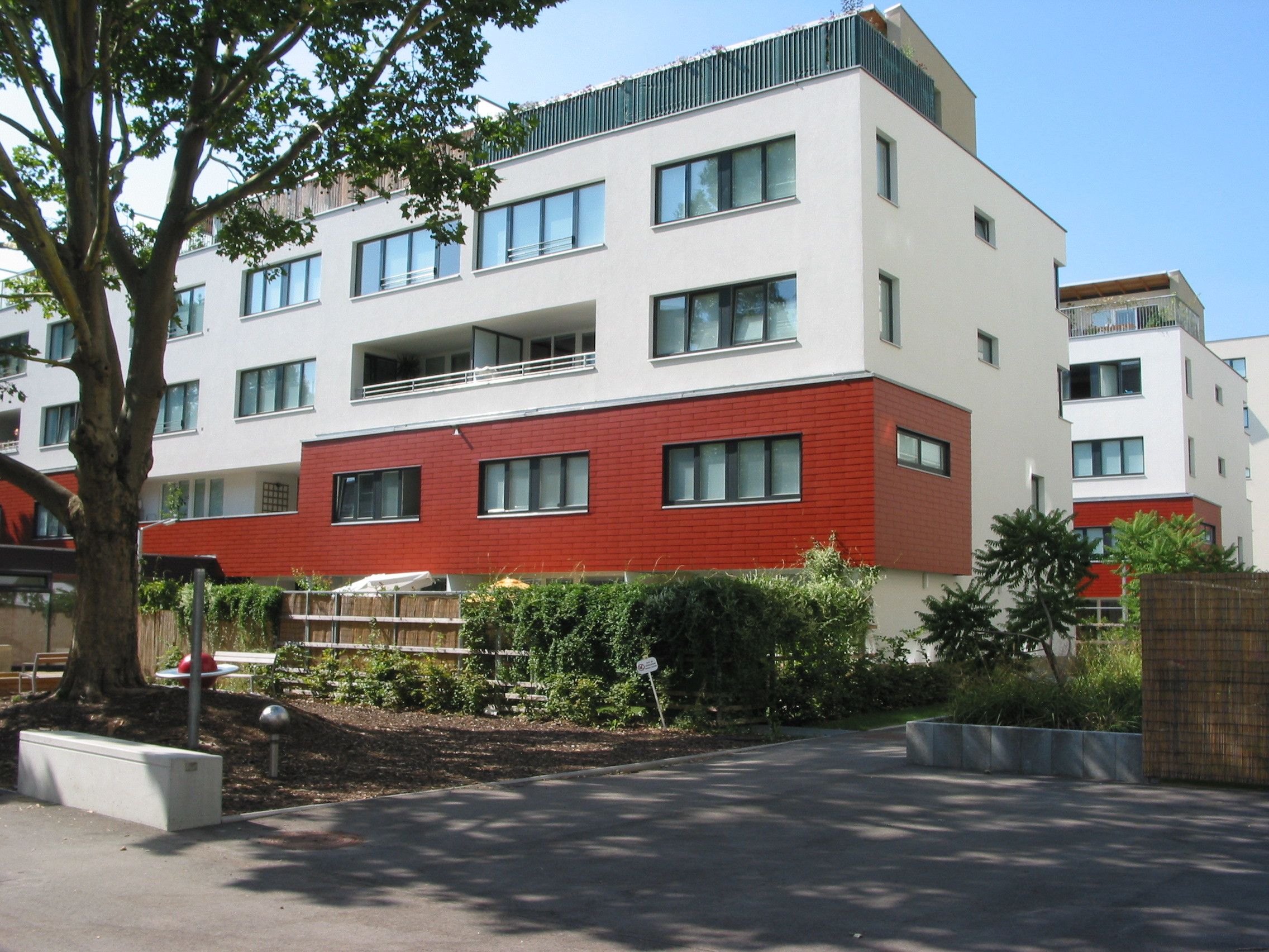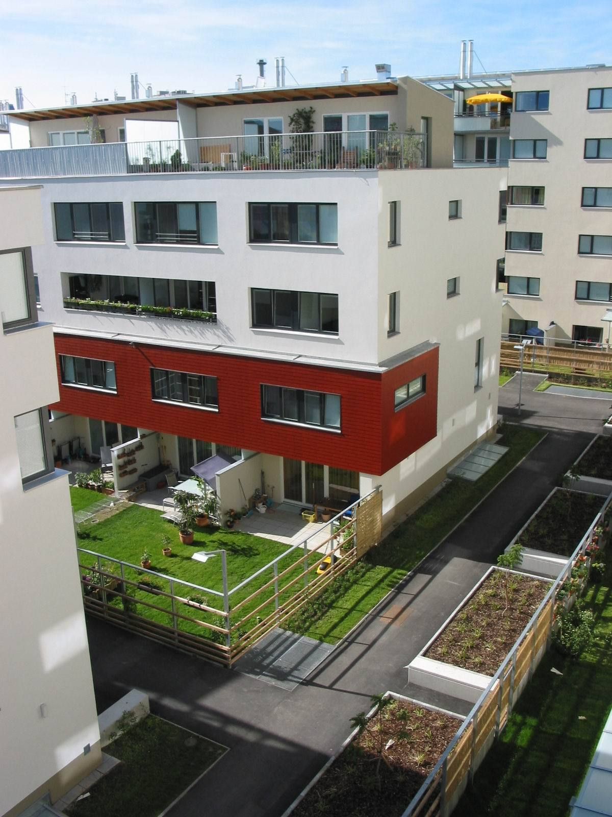 Die im Gartenhof liegenden 4 Trakte sind voll nach Süden ausgerichtet. Die umschließende Randbebauung ermöglicht einen ruhigen, durchgrünten Innenhof. Die niedrigen Hoftrakte erhalten damit den Charakter einer Gartensiedlung. Die Abstände der Baukörper im Gartenhof sind so situiert, dass selbst bei tief stehender Sonne (tlw. unter 30°) eine direkte Belichtung gegeben ist. Entsprechend den übergeordneten Vorgaben der Stadtplanung stehen vor allem größere familiengerechte Wohnungen mit Garten oder Dachterrassen, Loggien sowie erdgeschoßige Altenwohnungen mit Gartenanteil im Vordergrund (Generationenwohnungen auch möglich). 97,5 % der Wohnungen verfügen über Garten, Loggia oder Terrasse.