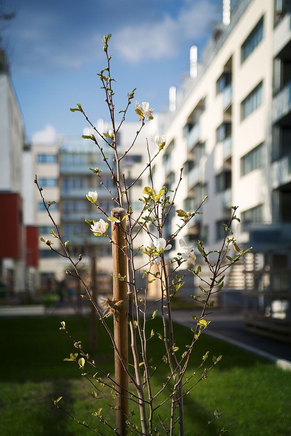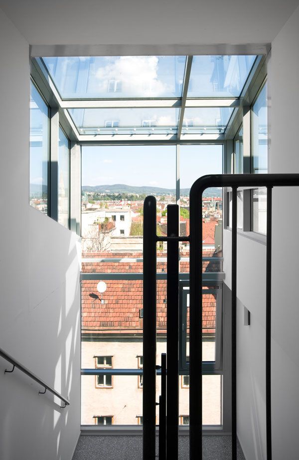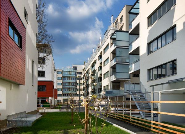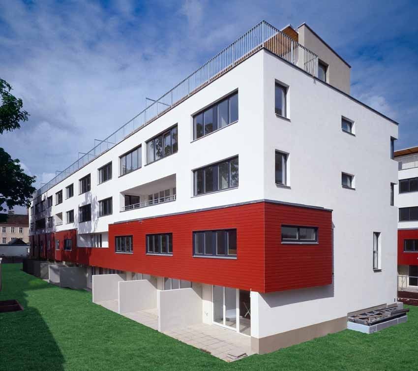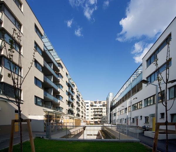Die im Gartenhof liegenden 4 Trakte sind voll nach Süden ausgerichtet. Die umschließende Randbebauung ermöglicht einen ruhigen, durchgrünten Innenhof. Die niedrigen Hoftrakte erhalten damit den Charakter einer Gartensiedlung. Die Abstände der Baukörper im Gartenhof sind so situiert, dass selbst bei tief stehender Sonne (tlw. unter 30°) eine direkte Belichtung gegeben ist. Entsprechend den übergeordneten Vorgaben der Stadtplanung stehen vor allem größere familiengerechte Wohnungen mit Garten oder Dachterrassen, Loggien sowie erdgeschoßige Altenwohnungen mit Gartenanteil im Vordergrund (Generationenwohnungen auch möglich). 97,5 % der Wohnungen verfügen über Garten, Loggia oder Terrasse.